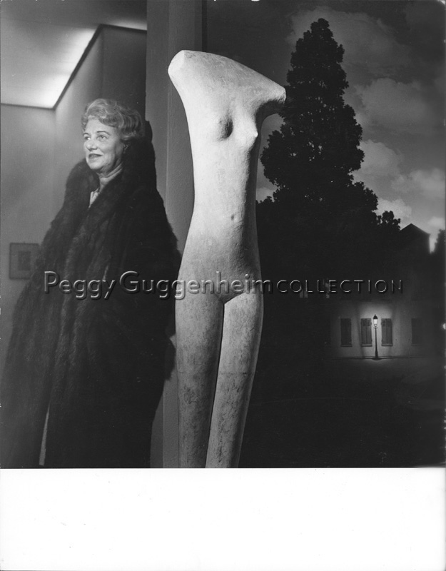 Peggy Guggenheim accanto al gesso di Giacometti, "Donna che cammina", e al dipinto di Magritte, "L'impero della luce", alla Tate Gallery, nel 1964