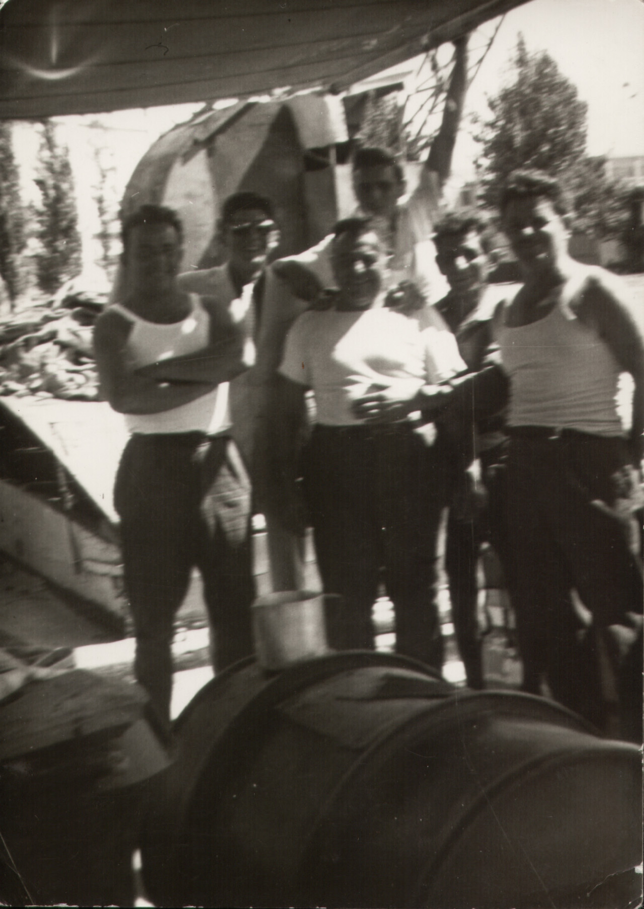 Foto ricordo di un gruppo di barcari a bordo di un'imbarcazione.