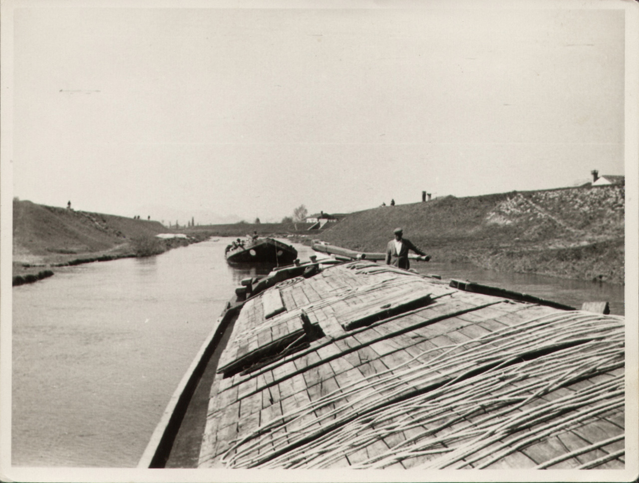 Anonimo, Canale Vigenzone tra Gorgo e Bovolenta, anni '50. Il barcaro Leonida Cappellozza al timone mentre, in viaggio verso Chioggia, con la barca traina un'altra imbarcazione.