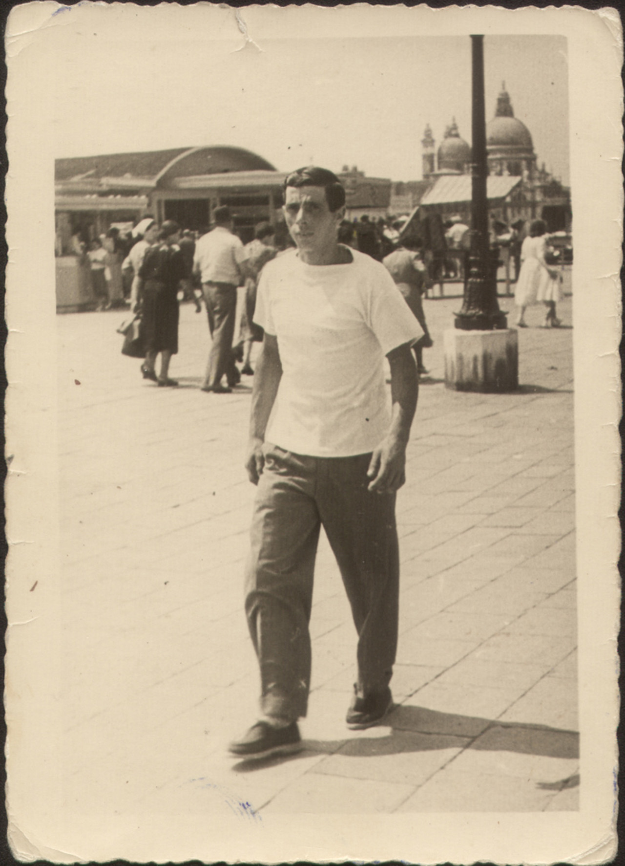 Foto ricordo del barcaro Riccardo Cappellozza mentre passeggia lungo Riva degli Schiavoni a Venezia.