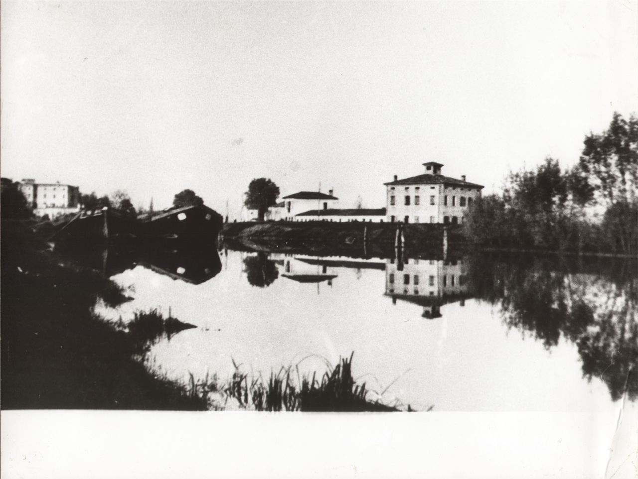 Burci ormeggiati nel canale Battaglia in prossimità della conca di navigazione e del paese di Battaglia Terme.