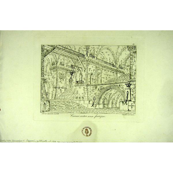 Carceri entro una fortezza Con la seguente annotazione manoscritta: 'Tavola della scenografia di Aquaroni pubblicata nel 1848, con iscrizione contro Pio IX'