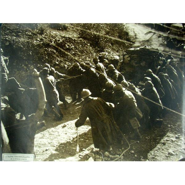 Sull' altopiano conquistato di Bainsizza traino a mano di un mezzo catturato agli austriaci