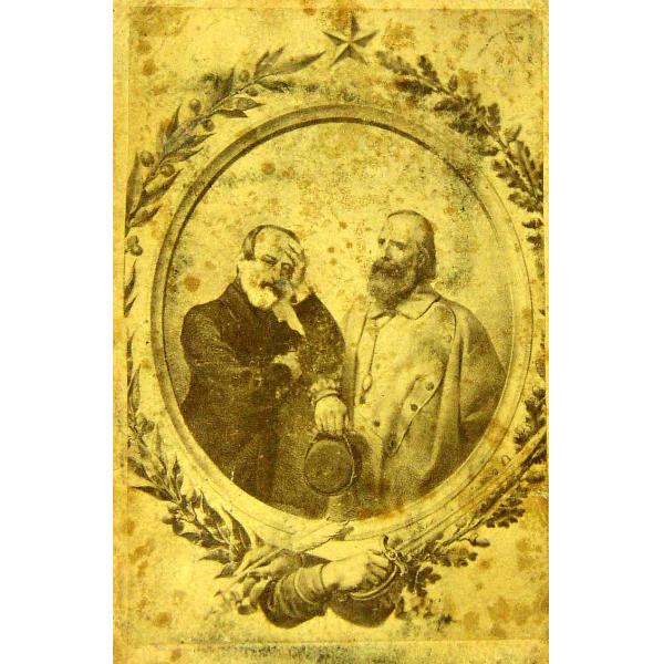 Collezione Aroldi Fotografia ritoccata a mano. Garibaldi e Mazzini sono inseriti all'interno di una cornice con serto di ulivo e quercia terminante con due mani impugnanti una spada e una penna