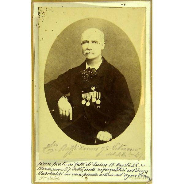 Emilio Raffi d'anni 72 veterano del 1848-1849 prese parte ai fatti di Larino 15 agosto 1848 e Morazzone 27 detto, indi rifugiatisi col Duce Garibaldi in una piccola osteria ad Agno [...] Veterano guerre Risorgimentali 1848-1870. Fotografia ritoccata a mano, la foto è quasi completamente staccata dal supporto secondario