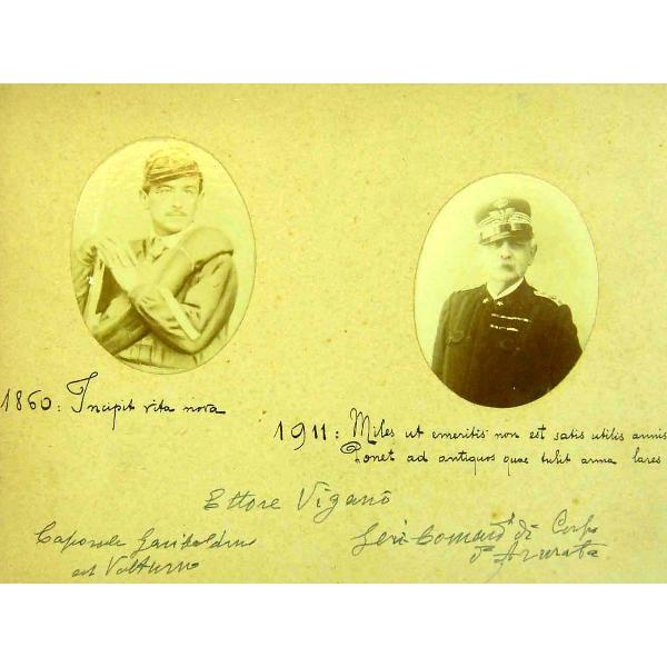 a) 1860: Incipit vita nova, 1911: Miles ut emeritis est satis utilis annis Ponet ad antiquos quae tulit arma lares, b) Ettore Viganò, Caporale garibaldino al Volturno, Generale Comandante di Corpo d'Armata, c) Dono del Generale Ademollo [annotazione a mat Su un cartoncino sono incollate, affiancate, due foto ovali di Ettore Viganò, una giovane caporale garibaldino e l'altra generale ormai anziano