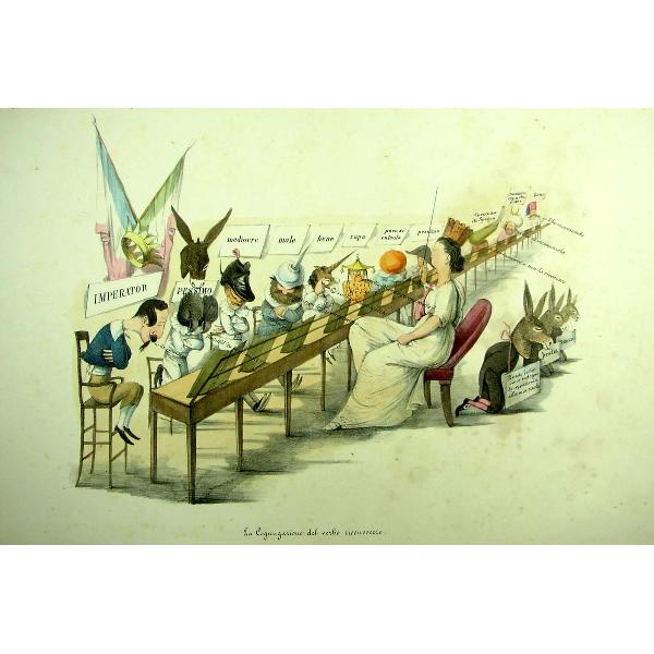 La cognugazione del verbo riconoscere Parte di serie: 'Satira' da 8a(1) a 8a(108) e serie nella serie: 'Album di caricature' da 8a(54) a 8a(78). Acquerellata a mano