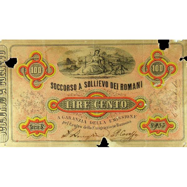 Soccorso a sollievo dei romani Parte di serie: 'Carta moneta' da 8b(91) a 8b(97). Acquerellata a mano. Sul retro un proclama a favore dell'unità