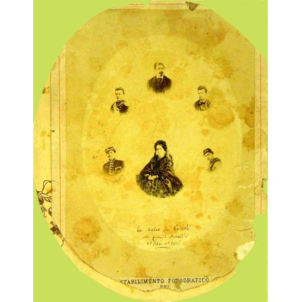 a) La madre dei Cairoli alla famiglia Mercantini nel febbraio del 1868, b) All'illustre Cittadino-Poeta Professore Luigi Mercantini, ed alla sua degna compagnia offro nelle mie supreme angoscie, Pavia 1 febbraio 1868 Adelaide Cairoli Bono [dedica autograf Fotografia, ritoccata a mano, realizzata con un fotomontaggio di cinque foto più piccole e un'incisione