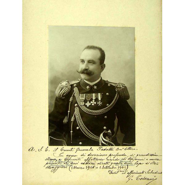 A Sua Eccellenza il Tenente Generale Pedotti comandante Ettore. In segno di devozione profonda, di grandissima stima, e deferente affettuoso ricordo di tre anni e mezzo passati ai suoi ordini diretti quale suo Capo di Stato Maggiore (1 marzo 1906-1 settem Il supporto riporta, incollata nella parte superiore, una piccola parte della carta velina, originale, a protezione della foto