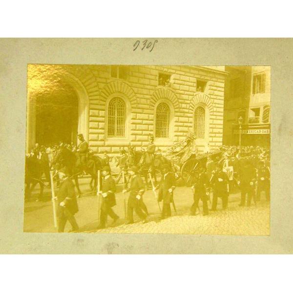 Funerali Cosenz [annotazione a matita] La foto riprende il corteo funebre del Generale Cosenz [morto il 28 settembre 1898 a Roma] mentre sfila per via Nazionale a Roma. Il feretro, con sopra l'elmo piumato del generale, come da prassi poggia su un affusto di cannone ed è trainato da 3 copp