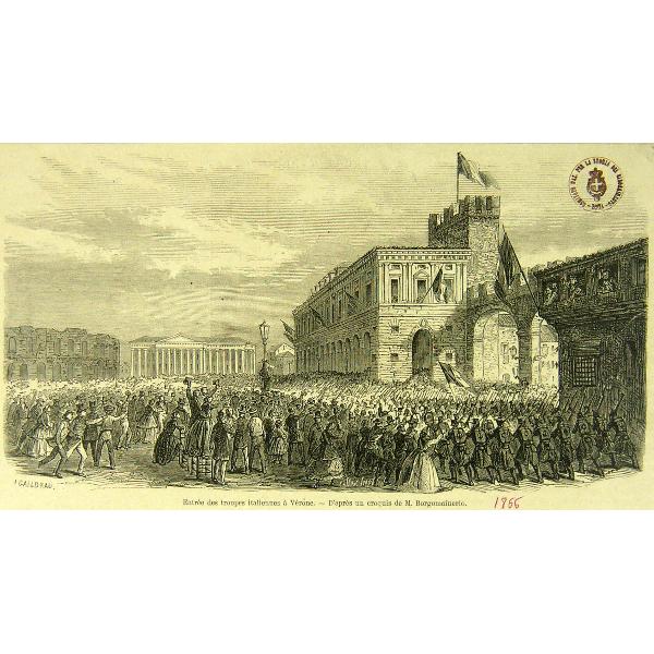 Entrèe des troupes italiennes à Verone Parte di serie: 'Terza guerra d' Indipendenza' da 9a(1) a 9a(90). Ritaglio di giornale. Con annotazioni manoscritte