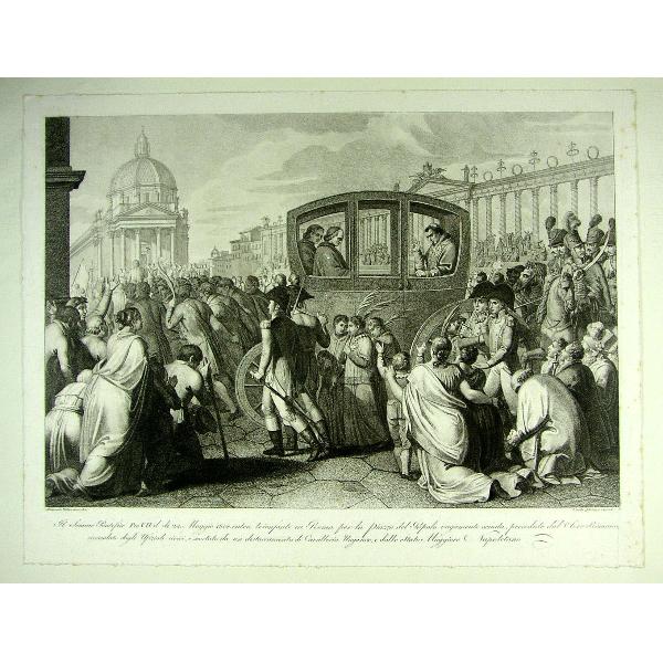 Il Sommo Pontefice Pio VII il dì 24 maggio 1814 entra trionfante in Roma per la piazza del Popolo vagamente ornata, preceduto dal Clero Romano, circondato dagli Ufiziali civici, e scortato da un distaccamento di Cavalleria Ungarese e dallo Stato Maggiore