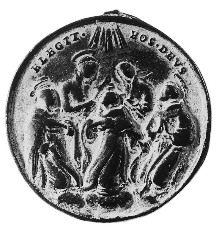 Medaglia. I cinque santi inginocchiati (protomartiri francescani, Bernardo, Pietro, Ottone, Accursio e Adiuto) e colomba dello Spirito Santo tra splendori