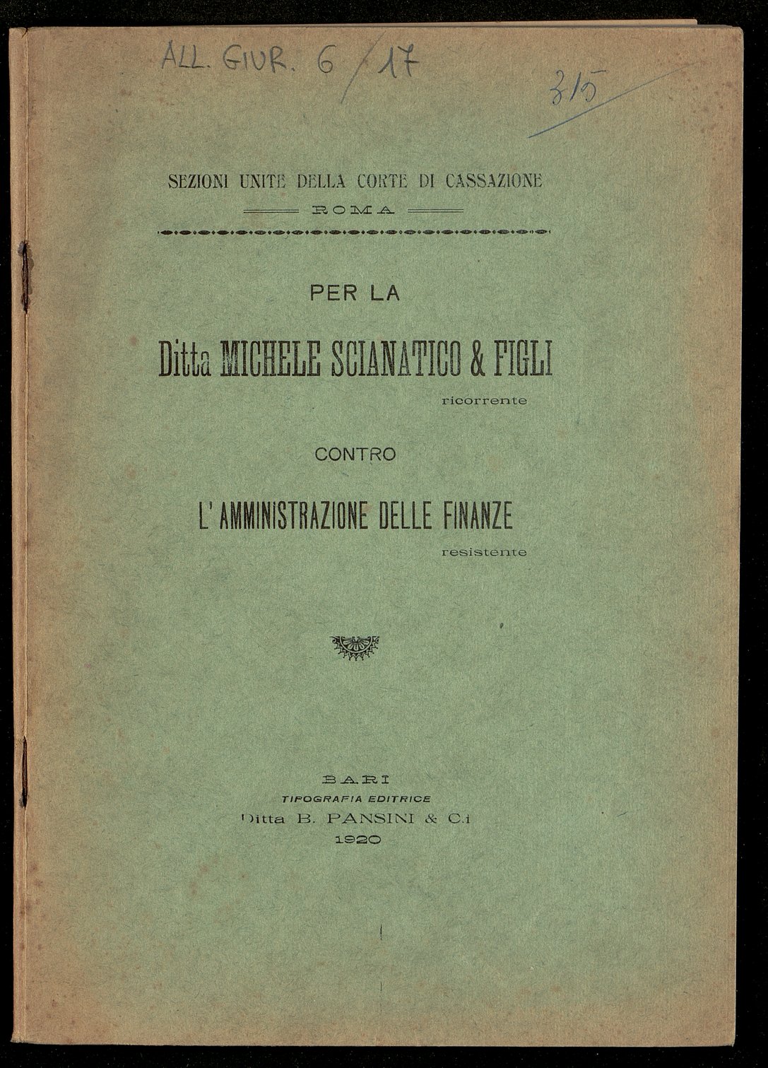 Identificatore: BA10048438; segnatura: Biblioteca provinciale S. Teresa dei Maschi - De Gemmis - Bari - IT-BA0136, inv. 11146, ALL. GIUR. 6 0017