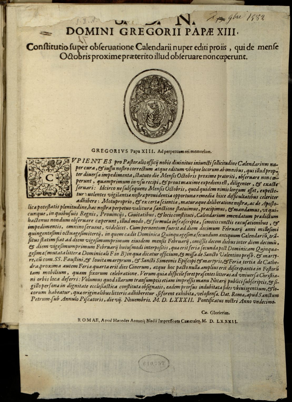 S.d.n. domini Gregorii papae XIII. Constitutio super obseruatione calendarii nuper editi pro iis, qui de mense Octobris proxime praeterito illud obsueruare non coeperunt.