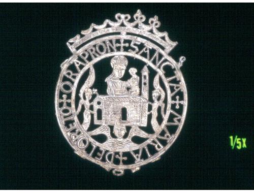 Toppa di serratura, coronamento a diadema.. Personaggi: Madonna; Bambino Gesù. Figure: angeli (3). Architetture: Santa Casa di Nazareth. Decorazioni: motivo ad anelletti incisi