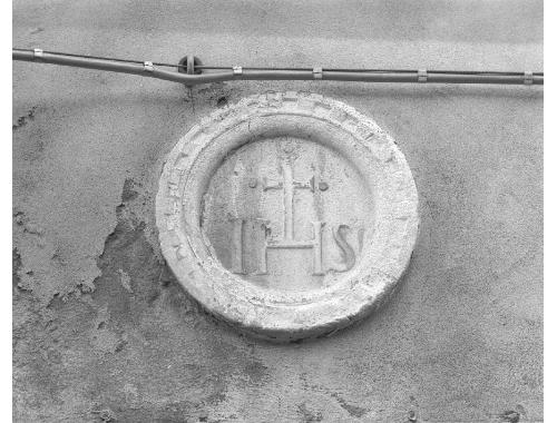 Entro cornice tonda a dentelli il monogramma presenta tracce di cromia d'epoca recente. Tre punti stanno ai vertici della croce.
